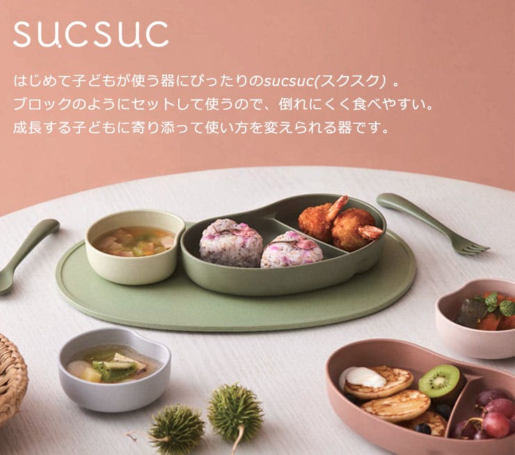 はじめて子どもが使う器にピッタリのsucsuc(スクスク)。 ブロックのようにセットして使うので倒れにくく食べやすく、成長に合わせてトレイなしでも使えます。 電子レンジ、食洗機が使用できるのはもちろん、環境に優しい竹配合の樹脂素材(TAK-REM)は抗菌作用があります。