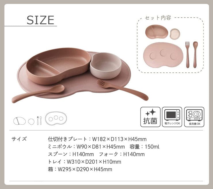 ●仕切り付きプレート W182×D113×H45mm ●ミニボウル W90×D81×H45mm / 容量:150ml ●スプーン H140mm ●フォーク H140mm ●トレイ W310×D201×H10mm