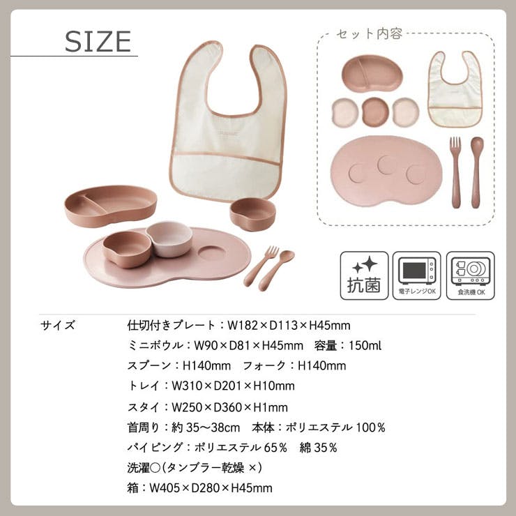 ●仕切り付きプレート W182×D113×H45mm ●ミニボウル×3 W90×D81×H45mm / 容量:150ml ●スプーン H140mm ●フォーク H140mm ●スタイ W250×D360×H1~ / 首周り 約35~38cm ●トレイ W310×D201×H10mm