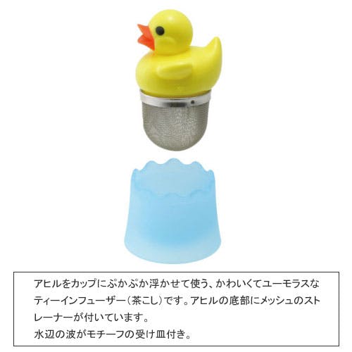 アヒルをカップにぷかぷか浮かせて使う、かわいくてユーモラスなティーインフューザー(茶こし)です。アヒルの底部分にメッシュのストレーナーが付いています。水辺の波がモチーフの受け皿付き。
