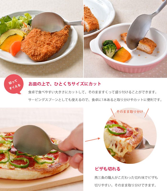 食卓でちょっと切りたいときに、包丁とまな板を出すのは面倒。「すくえるナイフ」ならお皿の上で片手でサッと使えて、すくって取り分けもできます。 サービングスプーンとしても使えるので、食卓に1本あると取り分けやカットに便利です。