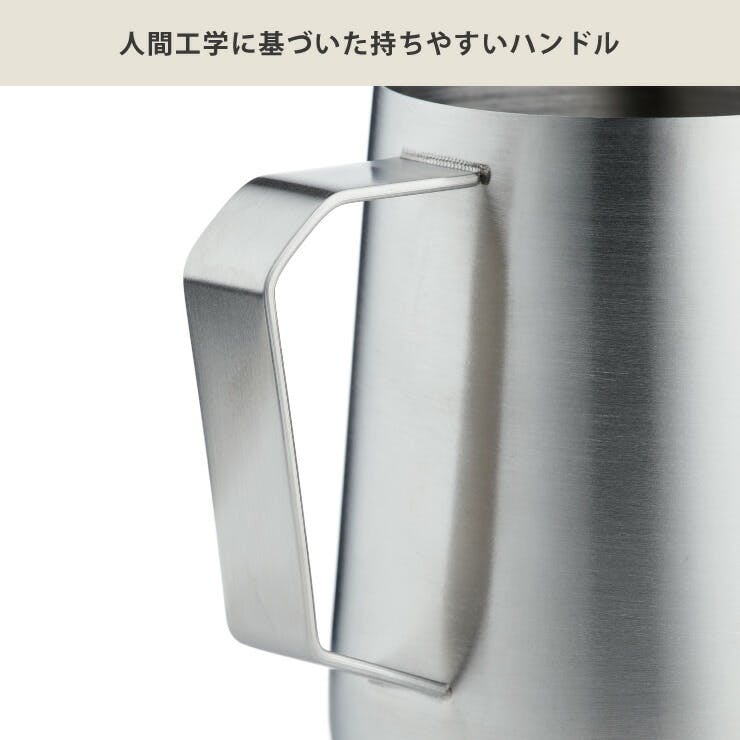 カスタマイズされた注ぎ口、溶接されたハンドル、ユニークな形はDhanTamang氏が考える完ぺきなミルクピッチャーです。 内面には200ml、300mlの目盛りがついています。