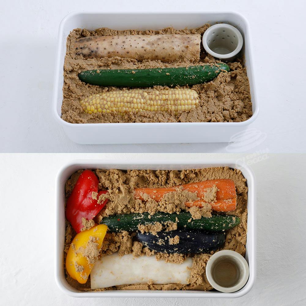 きゅうりやとうもろこしなどの長い食材も切らずにぬか漬け。表面がガラス質で雑菌が繁殖しにくく、清潔なホーローぬか漬け容器です。 ホーローは食品と化学反応を起こしにくく、食材の風味を損ないません。容器に匂いもつきにくく、ぬか漬け容器として最適な素材です。