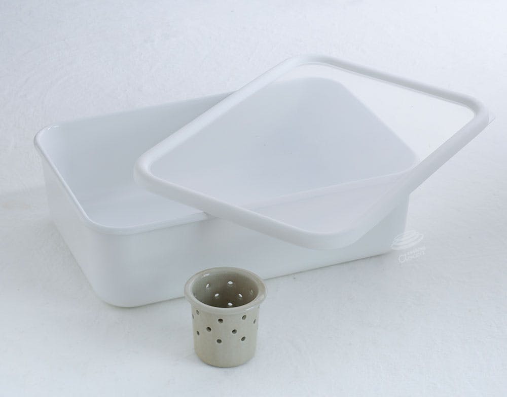 本体:ほうろう用鋼板、ふた:エラストマー、水取り器:陶器