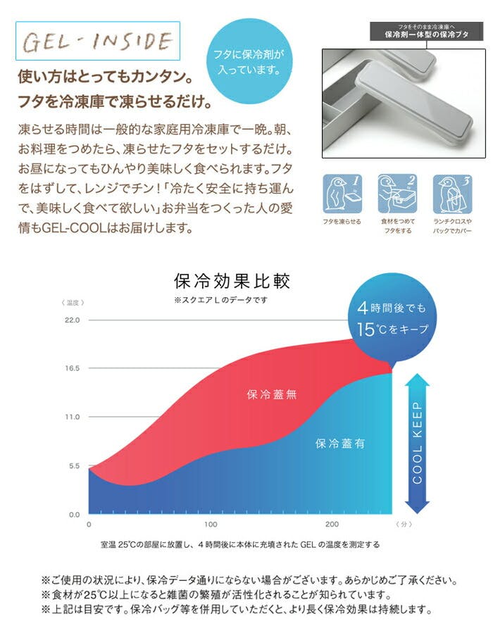 本体・仕切り:ポリプロピレン(耐熱140℃、耐冷-20℃) 保冷ブタ:ABS樹脂(耐熱60℃、耐冷-20℃) 中ブタ:SEBS樹脂熱可塑性エラストマー(耐熱120℃、耐冷-60℃) ゴムバンド:レーヨン・ポリエステル・ラバー