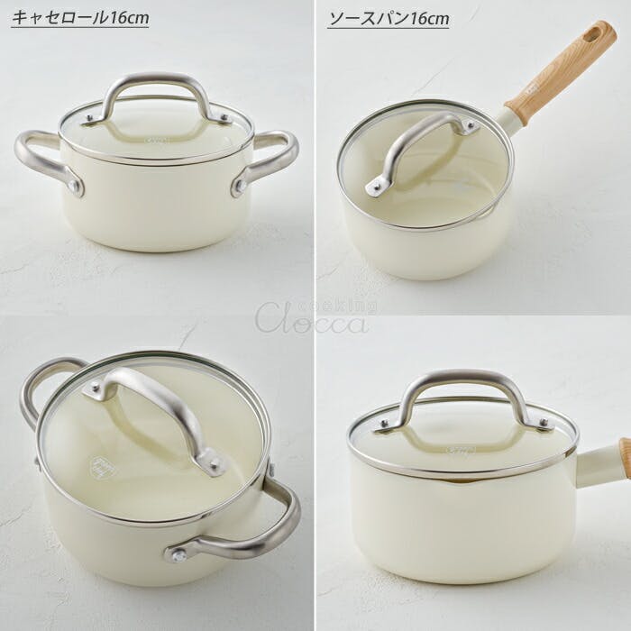 ビンテージホワイトのソースパン16cmとキャセロール16cmに使用できます。ステンレスの持ち手がアクセントになり、スタイリッシュになります。