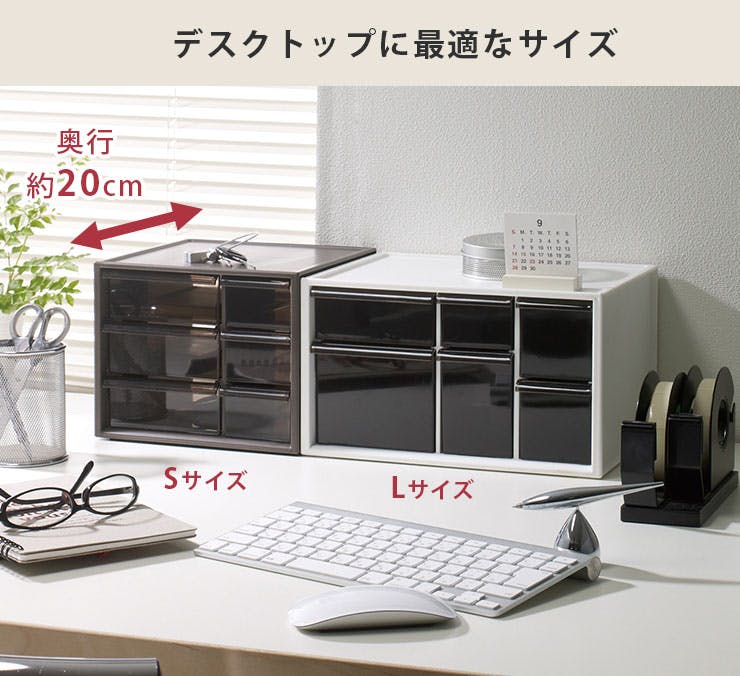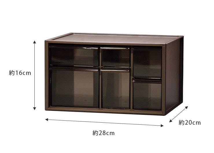 シンプルな機能とカラーリングのデスクトップ収納ケース。 中身が見えにくいクリアスモークの引き出しがスタイリッシュ。 デスク周りの小物(メモリーカードや乾電池・充電器)などの整理&収納におすすめです。 メイク道具や常備薬なども小分けにして収納できます。
