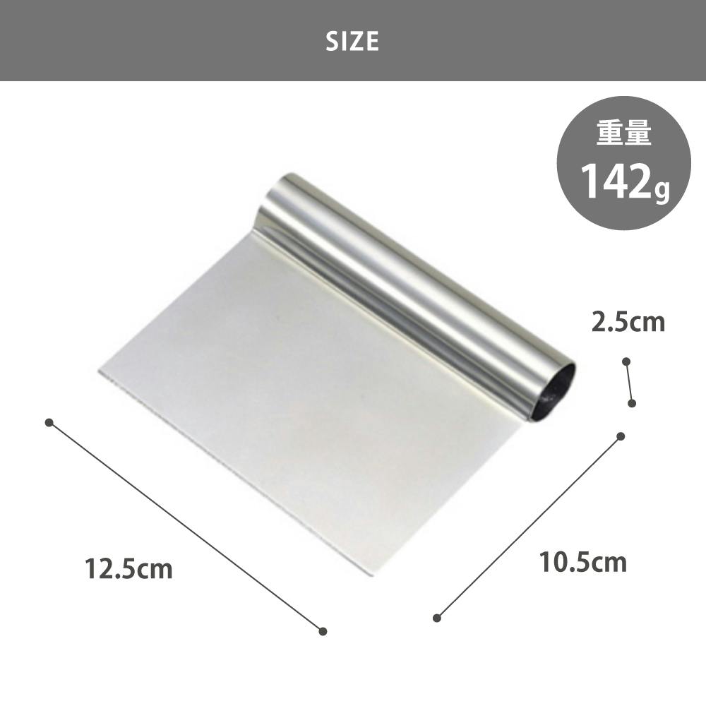 持ち手付きでしっかりと握れる、パン生地、パイ生地の捏ね合わせやカットに最適な金属製のスクレッパーです。 ステンレス製でお手入れラクラク。