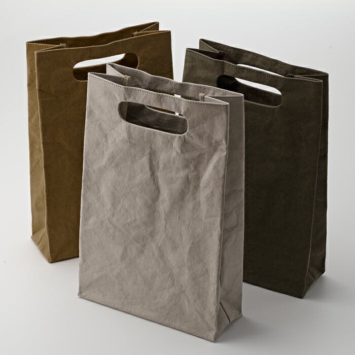 Mattroi(マッチョイ)のウォッシャブルペーパーバッグは、一見すると革製のようにも見えますが、紙の原料セルロース100%で出来ています。 素材はヨーロッパから買い付けて、ベトナムで独自に研究し手を加えて皮のようなシボ感を出しています。 ファッショナブルで新品でありながらエイジングな雰囲気を持った独特の手触りに仕上がっています。