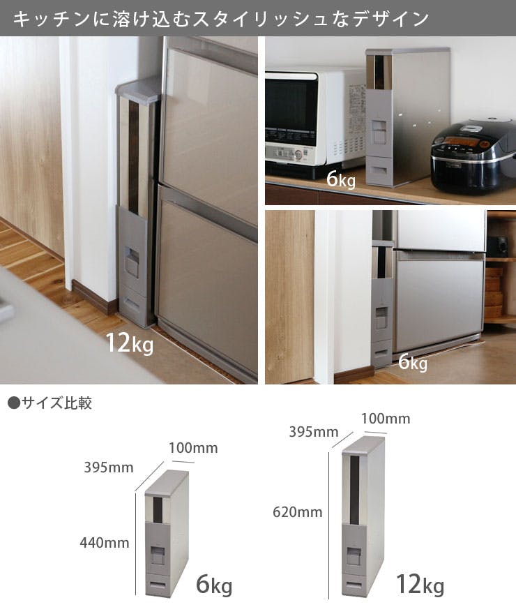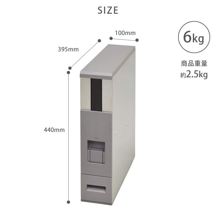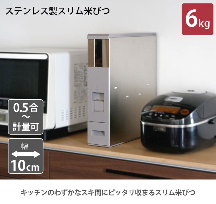 幅10cmでキッチンの隙間などに収納できるステンレス製米びつです。 ワンタッチで1合ずつ計量出来て便利。付属の0.5合アタッチメントを取り付ければ、ごはん一膳分(0.5合)ずつ計量できます。 また、底面にタイヤがついていて引き出すのも簡単。正面からはタイヤが見えずスマート。 本体は清潔感のあるステンレス製で、キッチンに溶け込むスタイリッシュなデザインです。