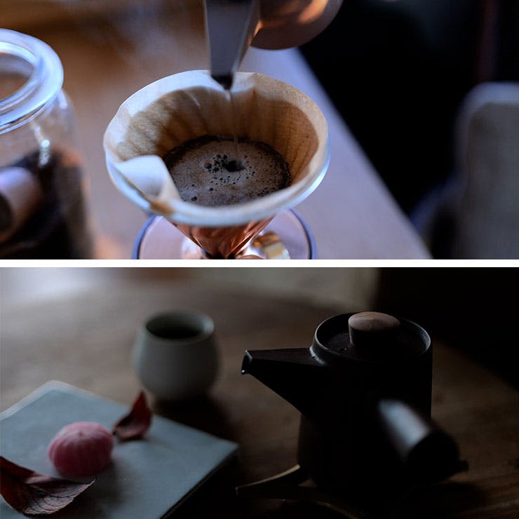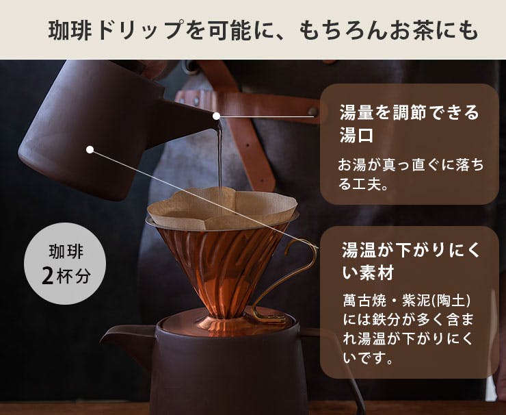 紫泥で丁寧に造られた珈琲や焙じ茶を美味しく淹れるための道具。 萬古焼・紫泥(陶土)のドリップ急須は土の手触りも優しく、金属臭や冷たさを感じずに気持ちよくドリップできる急須です。 珈琲約2杯分のドリップにちょうどよいサイズ。注ぎ口はお湯がまっすぐに落ちるように造られています。