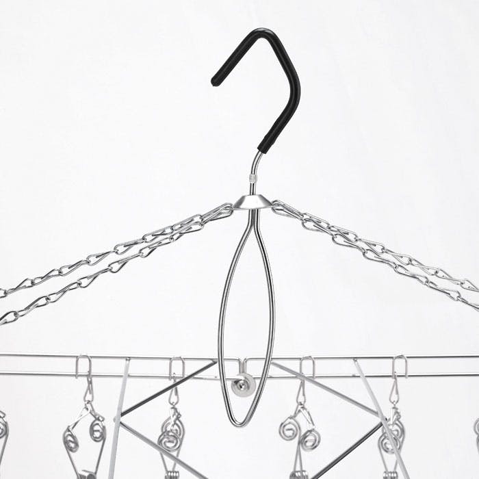 丈夫で清潔、永く使える18-8ステンレス製ピンチハンガー。 ステンレスは雨や夏の強い太陽の光による劣化にも強く、長い時間美しいまま清潔にお使い頂けます。指で掴む部分の面積を大きくし、つまみやすいのが特徴の「やさしいピンチ」を採用。 折りたたむとフックが外側に出るように設計されています。