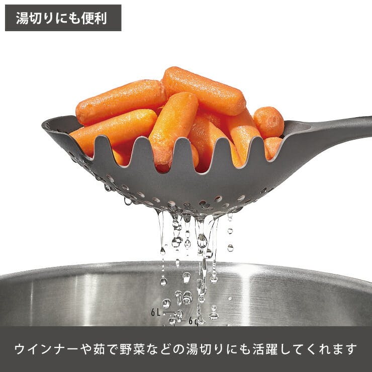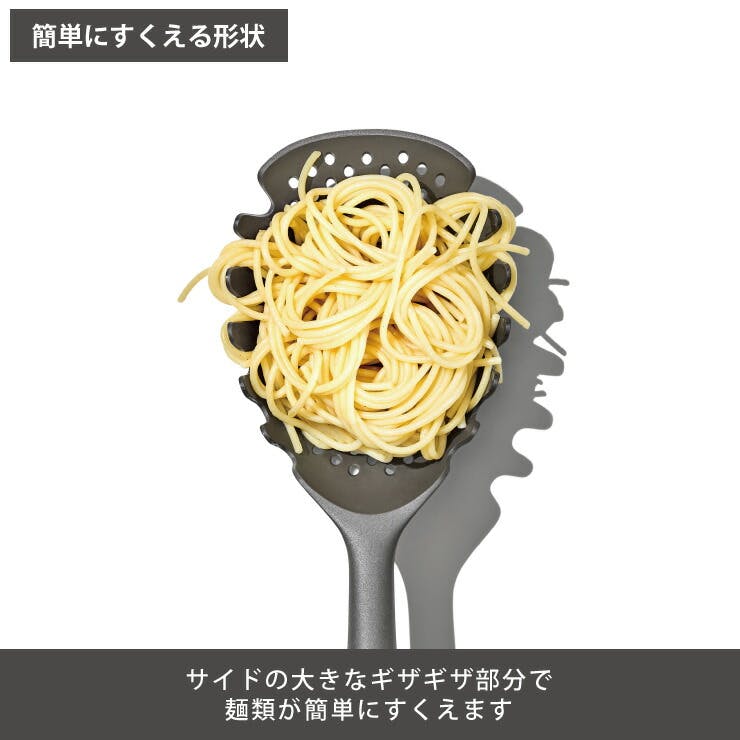 サイドのギザギザ部分で、スパゲッティやマカロニなどのパスタはもちろん、うどんやそばなどの麺類もかんたんにすくえるパスタスクープストレーナーです。 ナイロン製で鍋を傷つけず安心してお使いいただけます。 大き目のヘッドでポーチドエッグやゆで野菜などの湯切りにも活躍します。 濡れた手でもすべりにくい、やわらかく握りやすいハンドルで快適です。 漂白剤、食器洗い乾燥機がご使用いただけます。