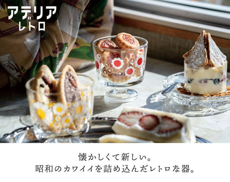 懐かしくて新しい。昭和のカワイイを詰め込んだレトロな脚付きグラス。 昭和当時は脚付きのデザートグラスがよく見られ、レストランや純喫茶の象徴的なアイテム。 しっかりとしたパッケージに入っているのも嬉しいポイントです。 フルーツやお菓子を盛り付けて喫茶気分をお楽しみください。