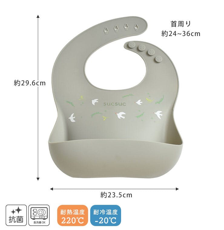 シリコーン素材のビブ。 カラーにあわせたそれぞれのデザイン。 首回りは4段階調節ができ、立体的なポケットが子供の食べこぼしをキャッチしてくれます。 抗菌仕様のシリコーン素材で、食器洗浄機で丸洗いもできます。
