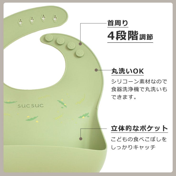 シリコーン素材のビブ。 カラーにあわせたそれぞれのデザイン。 首回りは4段階調節ができ、立体的なポケットが子供の食べこぼしをキャッチしてくれます。 抗菌仕様のシリコーン素材で、食器洗浄機で丸洗いもできます。