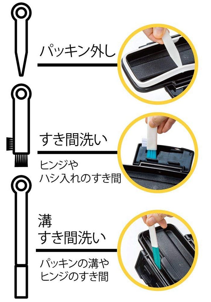 お弁当箱やシール容器などのパッキンの溝やすき間の汚れを落とします。取り出しにくいパッキン外しも付いてます。