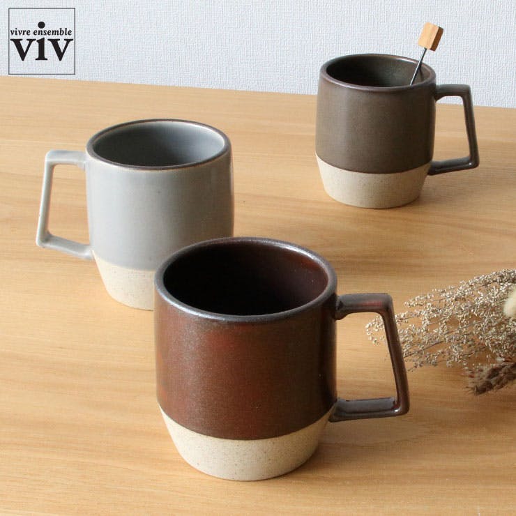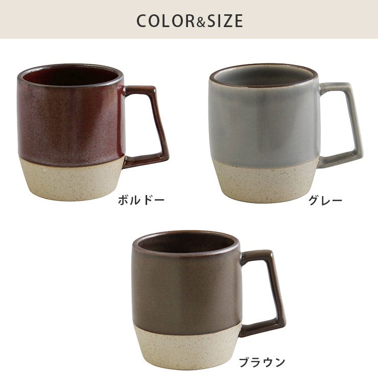 生地を残すように釉薬がかけられたバイカラーのような模様と、角ばったスタイリッシュな形状が目を引くデザイン。 持ち手部分が広く、しっかり握れる形状です。 電子レンジでの温め、食洗機でのお手入れに対応しており、おうちでもオフィスでも日常使いにおすすめのおしゃれなマグカップです。