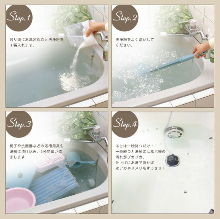 「お風呂まるごと洗浄剤」は、残り湯に入れてつけ置きするだけで、風呂釜から浴槽、洗面用具まで丸洗い。 つけ置き後のお風呂は、まるで新品に戻ったかのようにツルツルに。