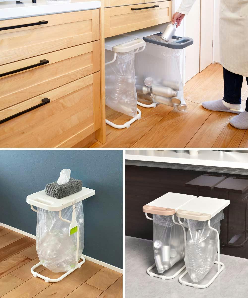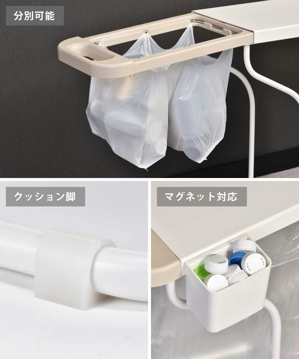 スライド開閉なので、カウンター下、棚の下など上のスペースが狭い場所に最適なゴミ袋スタンド。 サイドの曲線フレームにより作業スペースの確保ができ、ゴミ袋の交換もスムーズにできます。 また引き出し時にゴミ袋を引っかかりにくくします。