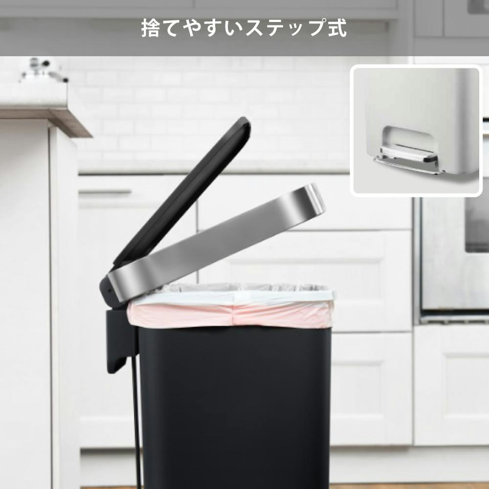 大容量45Lサイズでごみのよく出るキッチンにもぴったりなステップ式ごみ箱。 ペダルを踏むことで蓋がスムーズに開きます。閉まるときはゆっくりと静かに閉まります。開閉がスムーズで静かなので置く場所を選びません。 蓋は開けたまま固定できるので、ゴミ袋の交換時や作業時に便利です。
