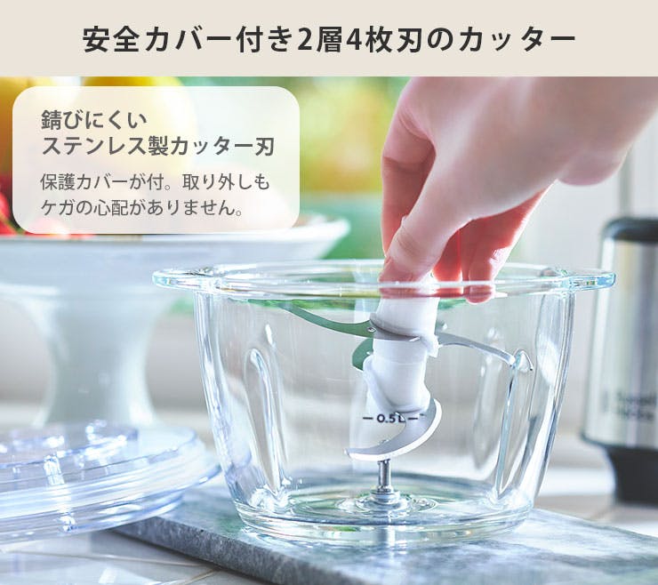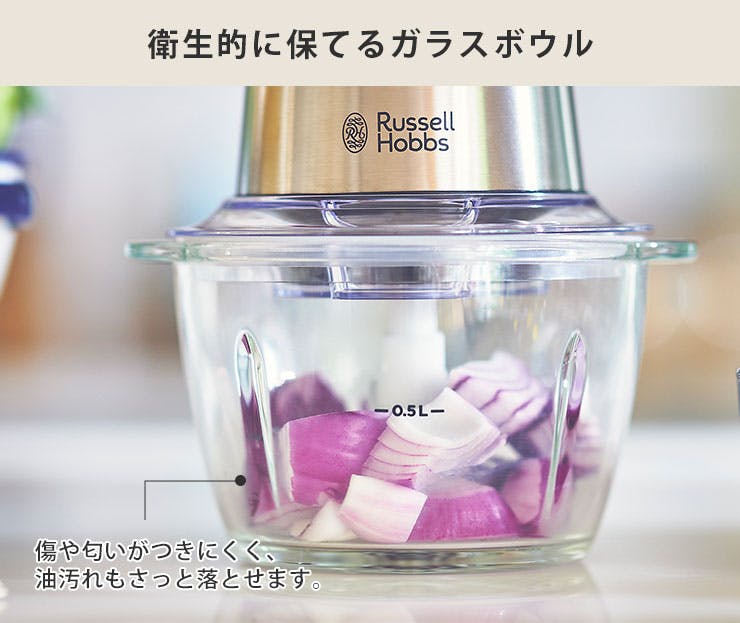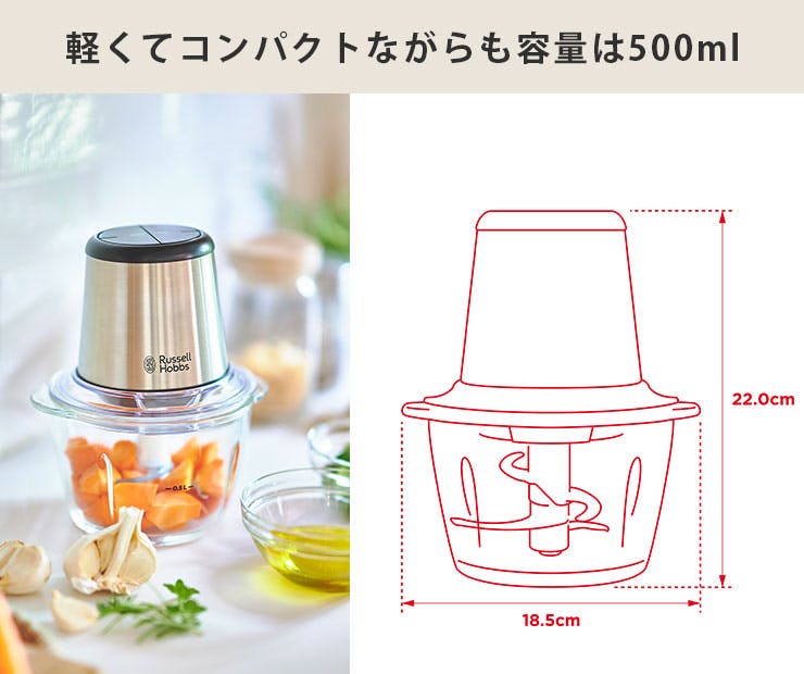 ラッセルホブスらしい、シンプルでスタイリッシュなデザイン。 使い勝手の良いコンパクトなチョッパーは、料理にスピードとアイデアをもたらします。 省スペース・短時間で料理をサポート。 ヘルシーなレパートリーはもちろん、離乳食や介護食など広い世代に頼りになる調理器具です。 ライフスタイルに合わせて、使いたい食材や量を自由にお使い頂けます。