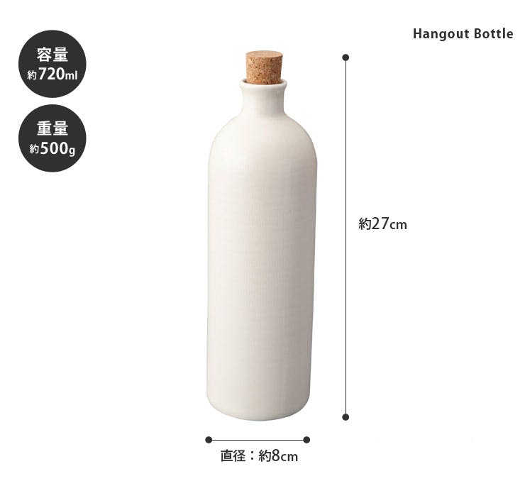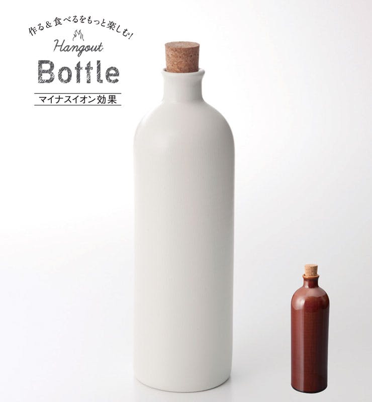 「作る&食べるをもっと楽しむ」 キッチンとアウトドアの境目を無くし、もっと自由に料理を作ること食べることを楽しみたいそんな願いから生まれたhangoutシリーズ。 中に入れた酒類や水をまろやかにする信楽焼のボトルです。 信楽の粘土から採取された「ラジウム鉱石」から発生するマイナスイオン効果により、酒類や水をはじめ食材の味をまろやかに感じる効果があります。 また、水のカルキ臭も取り除かれます。 蓋にはコルクを使用し、フォルムやカラーもスマートでありながらアウトドアの雰囲気を持たせたデザイン。