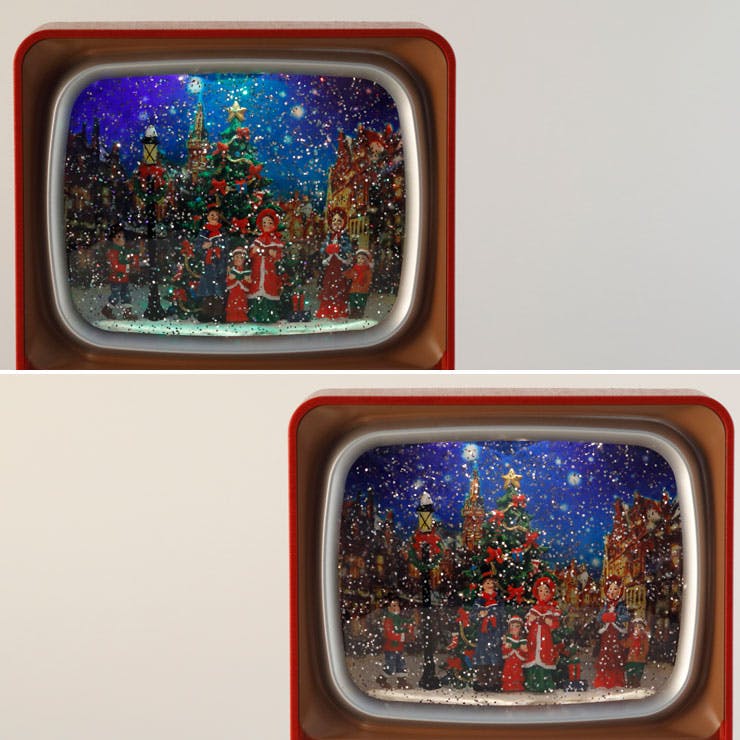 レトロなブラウン管テレビ型のクリスマスウォーターグローブ。 中はクリスマスツリーの前で聖書を手にした人々、プレゼントを運ぶ人の様子が描かれています。 土台の落ち着いた赤のカラーリングは大人のクリスマスにもぴったりです。