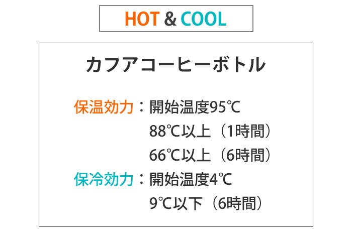 [保温効力] 開始温度95℃ 1時間後:88℃以上、6時間後:66℃以上 [保冷効力] 開始温度4℃ 6時間後:9℃以下