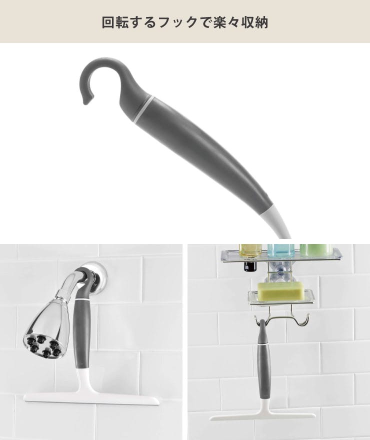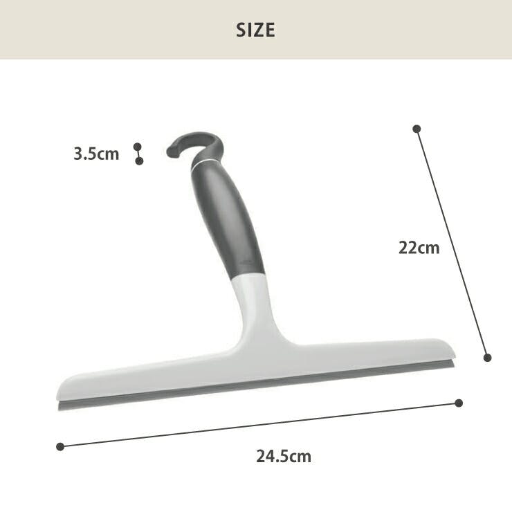 ワイパーのような水切り部のデザインです。お風呂場や窓の水切りにオススメです。 柔らかく回転するフックはシャワーヘッドやラック、タオルハンガーなどに掛けることができ便利。 丈夫なワイパー部分で筋が残りにくいワイパースクィージーです。