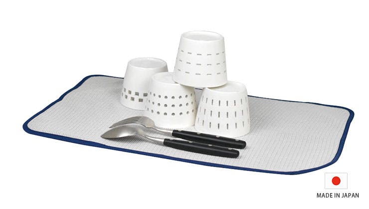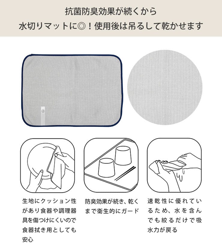 抗菌効果が長く続く水切りマット。防臭効果が続き、乾くまで衛生的にガードします。 生地にクッション性があり食器や調理器具を傷つけにくいので食器拭きとしても安心して使えます。