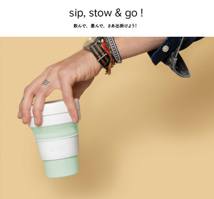 「stojo(ストージョ)」とは、英単語 stow(場所・容器にしまい込む)とスラングのJOE(コーヒー)を組み合わせた造語です。 その名のとおり、コーヒーを飲んだ後に、カップをクシャッと折り畳んで、バッグにしまって持ち運べます。 「マイタンブラーやマイカップを普段使用しているけど、持ち運びの際に邪魔で.....」という方にはピッタリです。 また、割れる心配もなく、折り畳めて持ち運べるので、キャンプやピクニック等のアウトドアシーンやスポーツシーンでも大活躍です。