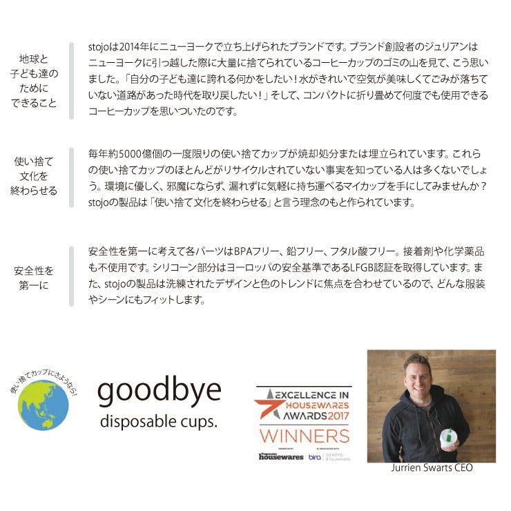 stojoは2014年にニューヨークで立ち上げられたブランドです。ブランド創設者のジュリアンは、ニューヨークに引っ越した際に、大量に捨てられているコーヒーカップのゴミの山を見て、「自分の子供達に誇れる何かをしたい!水が奇麗で、空気が美味しくて、ごみが落ちていない道路があった時代を取り戻したい!」との思いから、コンパクトに折り畳めて何度でも使用できるコーヒーカップを思いついたのです。 毎年約5000億個の、一度限りの使い捨てカップが、焼却処分または埋立られています。これらの使い捨てカップのほとん
