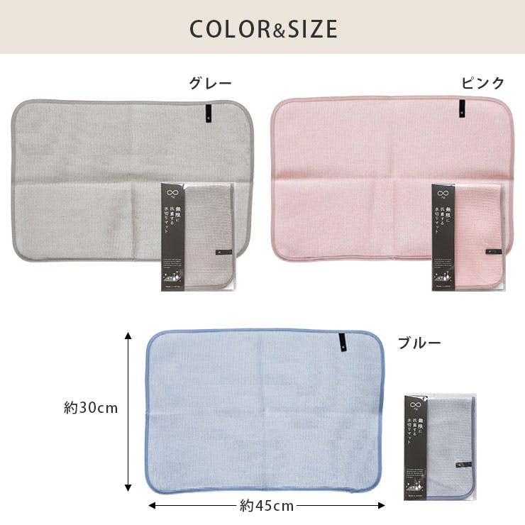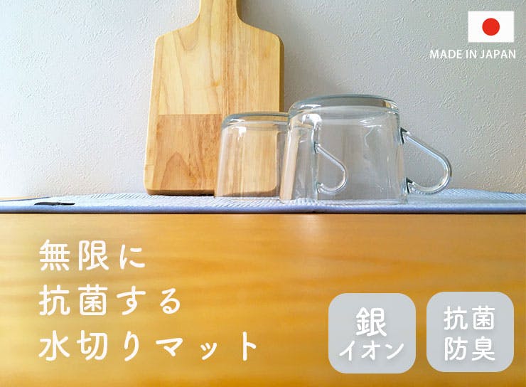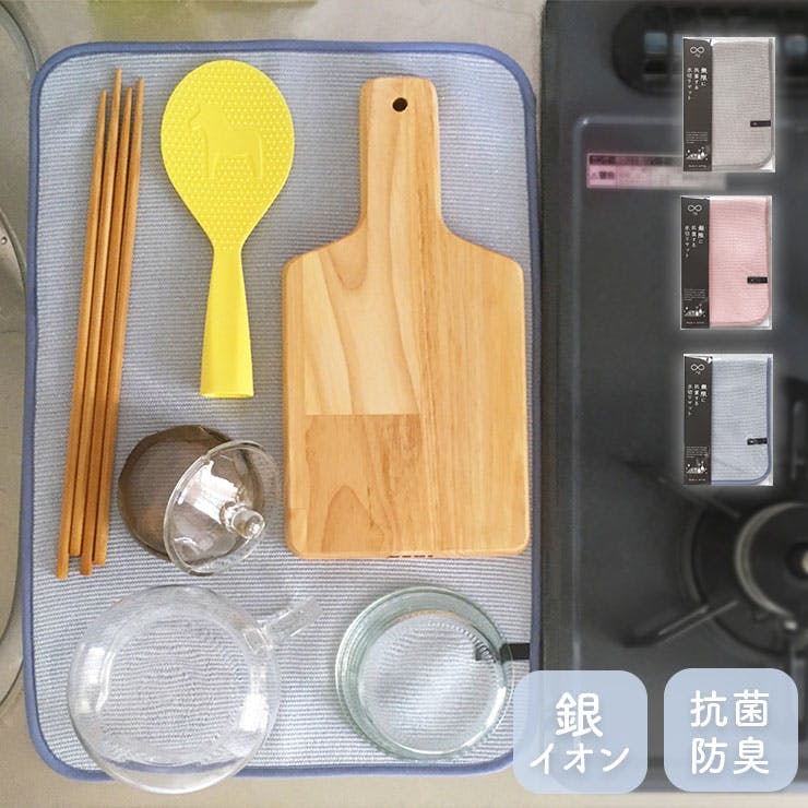 三層構造のニット地のクッション性で食器や調理器具を傷つけにくく、底付きの嫌な音も防げます。 かさばる水切りカゴの代わりに敷くと、たくさんの水分をキャッチしてくれます。 吸水力と速乾性に優れ、絞るだけですぐに吸水力が戻るのでデイリー使いにオススメです。食器拭き用のふきんとしても安心して使えます。 糸の一部に「ミューファン」を使用。表面にきらりと輝く純銀の糸から発生する銀イオンのチカラで抗菌・防臭機能が持続されるため、雑菌の繁殖を抑え、嫌な臭いの発生を防ぎます。 使用後は吊るして乾かせます。
