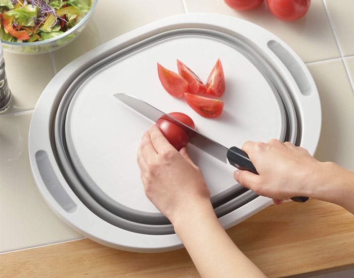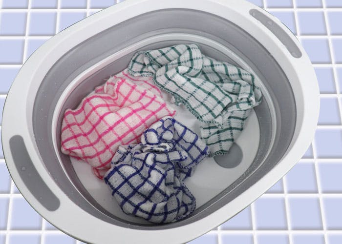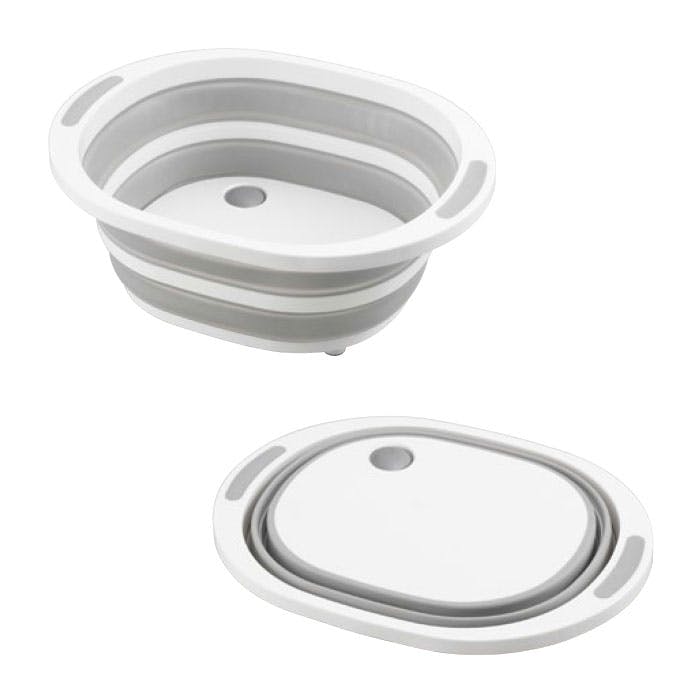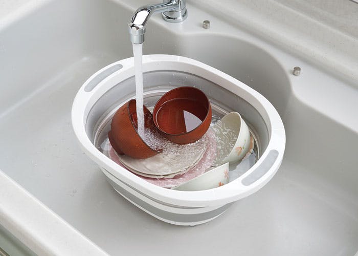 水回りをスッキリきれいに収納。 収納時に場所を取らない折り畳みタイプの洗い桶。 食器洗いや洗濯物のつけ置き洗いなどに便利です。 排水弁を押して溜めた水をラクに流せます。