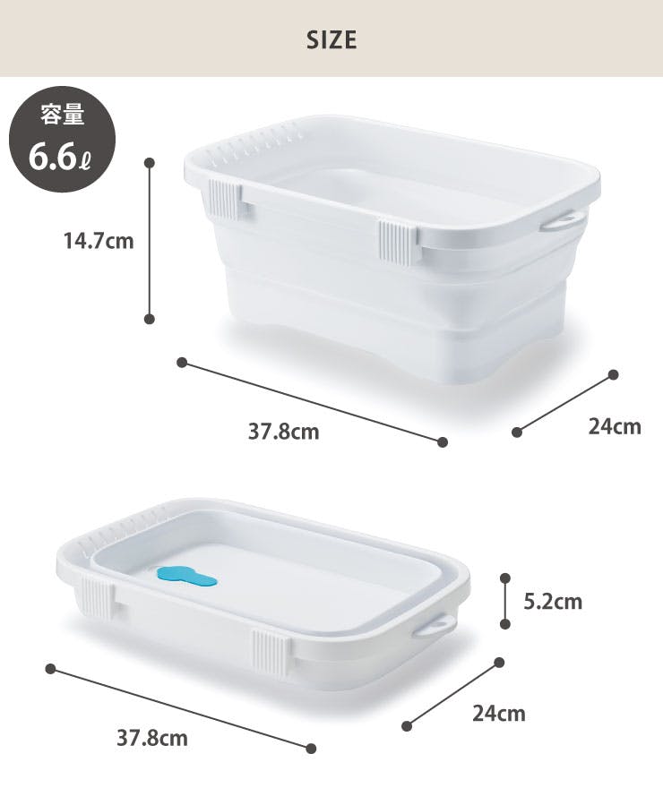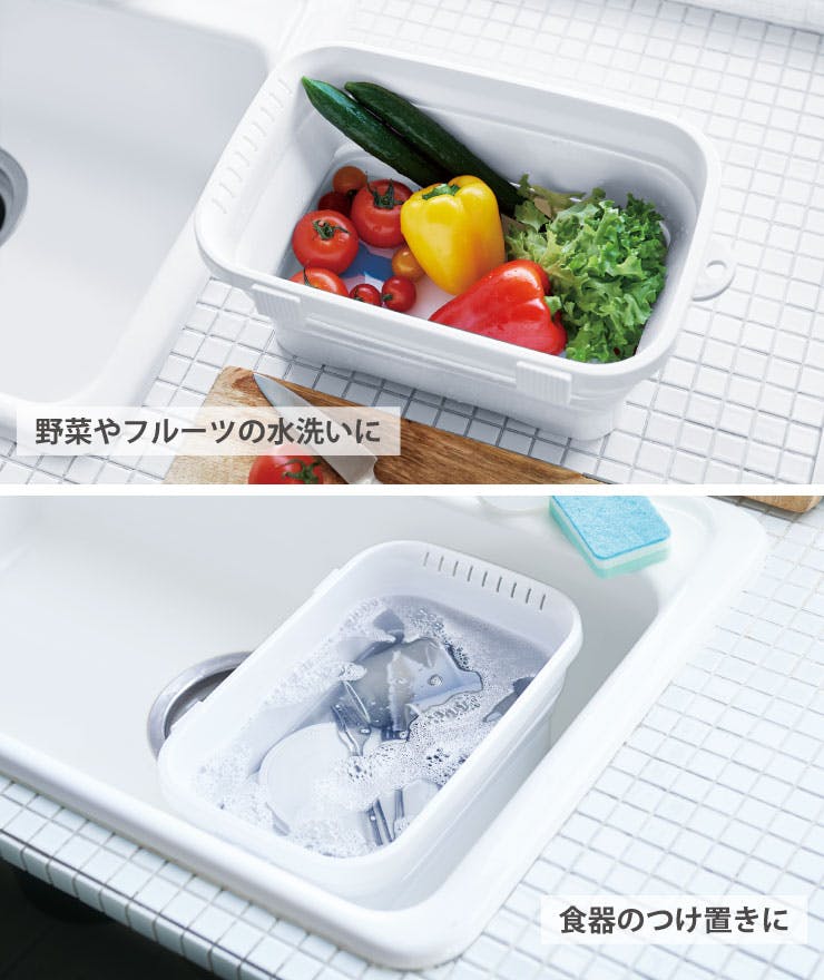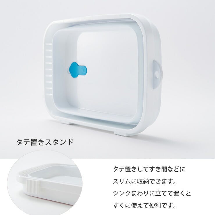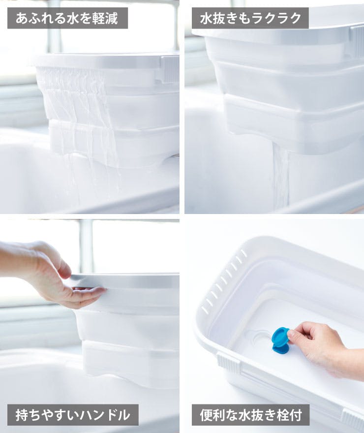 折りたたみできるキッチン用の洗い桶。 両手で本体をしっかり持って、同時に押し下げるとコンパクトにたためます。 使用後は折りたたんで、タテ置きしてすき間などにスリムに収納できます。吊るして収納できるフック穴付き。