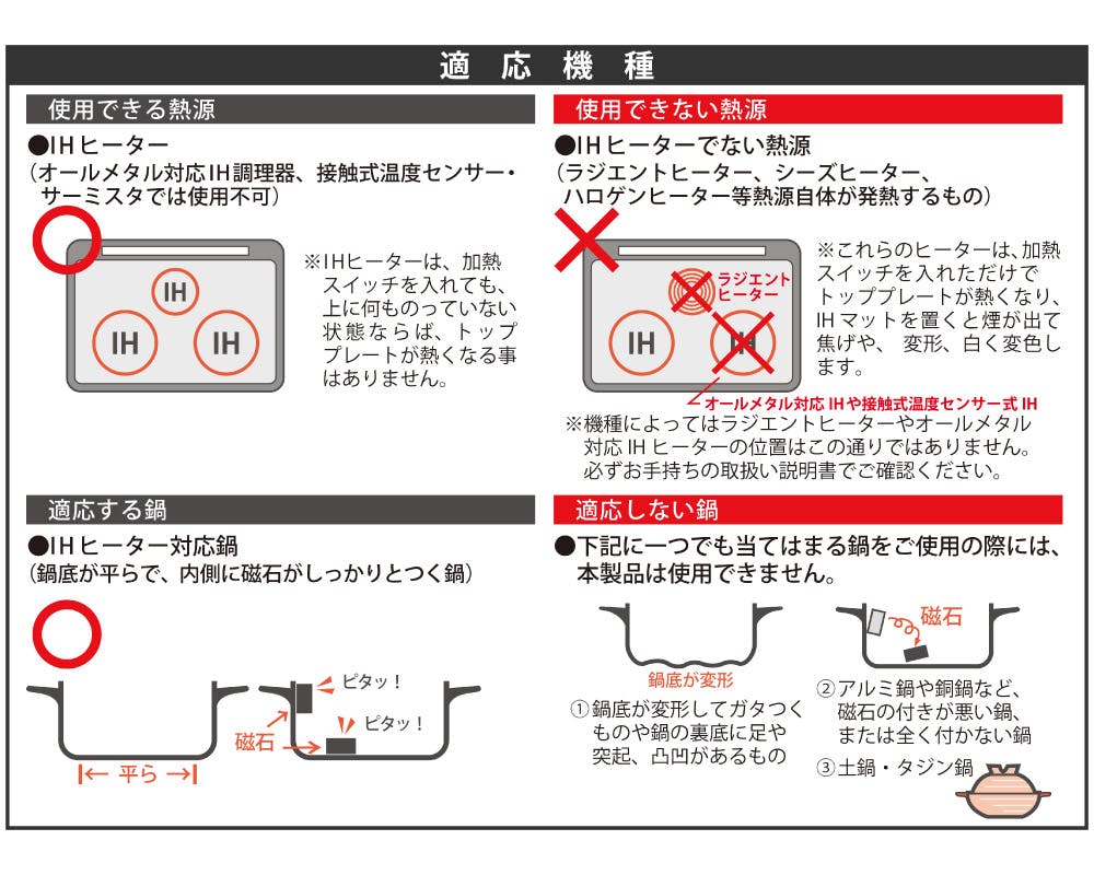 ○IHヒーター以外の熱源(ラジエントヒーター、シーズヒーター、ハロゲンヒーター等)では使用できません。 ○IHヒーター非対応の調理器具使用できません。 ○火災リスクがあるため揚げ物料理には使用できません。