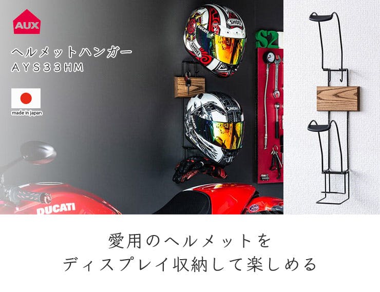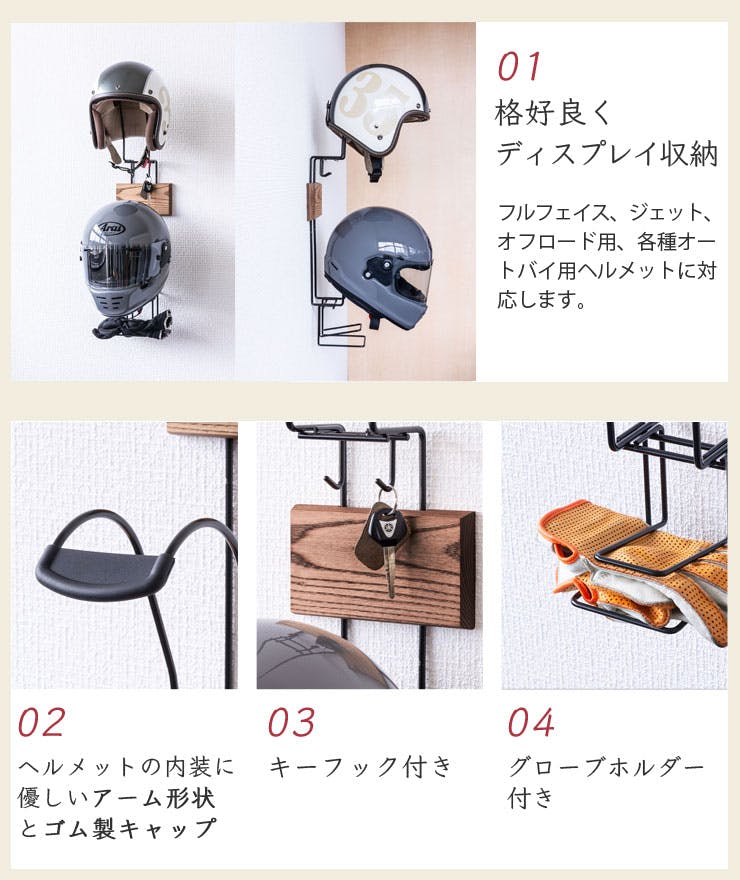 愛用のヘルメットを室内にディスプレイ収納して楽しめるヘルメットハンガー。 オートバイ等のヘルメットを室内の壁にショップディスプレイのように収納して楽しめます。 ホワイトアッシュ材の四角いボードは木目を活かしたオイルステイン仕上げ。 黒いスチール製フックと相性よくシックな高級感を演出します。
