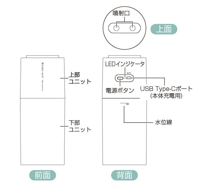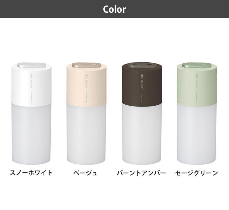 充電式なので生活にあわせて、昼はリビング、夜はベッドサイドなど、自分のいる場所に持ち運べるポータブル加湿器です。 パソコンやお手持ちのUSB-AC充電器で充電できます。動作音はささやくように静かで仕事や睡眠の邪魔をしません。 小型ながら2つの噴霧口でパワフルミスト、静音設計でアロマウォーターにも対応しています。