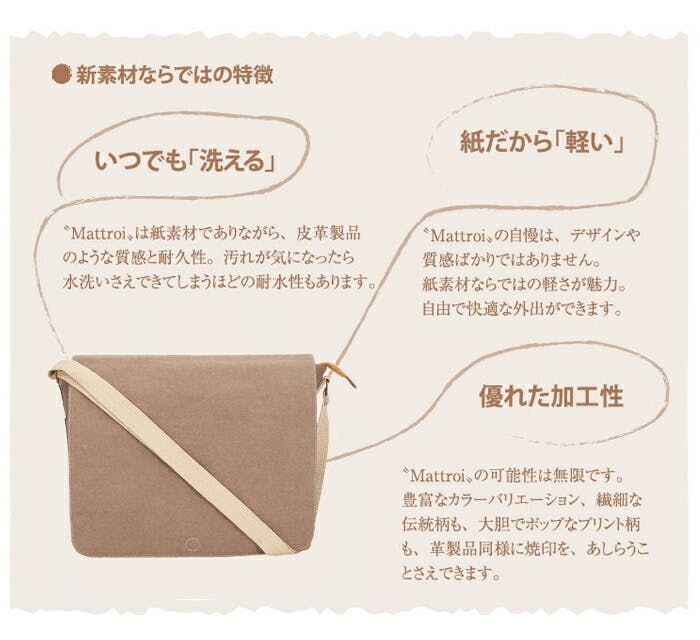 Mattroi(マッチョイ)のウォッシャブルペーパーバッグは、一見すると革製のようにも見えますが、紙の原料セルロース100%で出来ています。 素材はヨーロッパから買い付けて、ベトナムで独自に研究し手を加えて皮のようなシボ感を出しています。 ファッショナブルで新品でありながらエイジングな雰囲気を持った独特の手触りに仕上がっています。