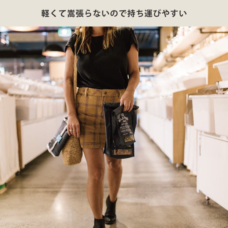 バルクフードバッグは、BPAフリーで食品に安全なリサイクルプラスチックドリンクボトルから作られています。 必要な分量をバッグへ詰めたら、口部分をクルッと巻いて面ファスナーで止めるだけ。1個単位で販売されている野菜等を入れる袋としても活躍します。