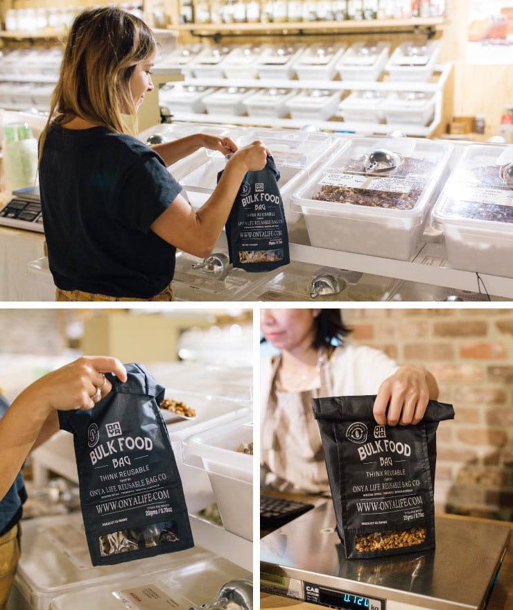 バルクフードバッグは、BPAフリーで食品に安全なリサイクルプラスチックドリンクボトルから作られています。 必要な分量をバッグへ詰めたら、口部分をクルッと巻いて面ファスナーで止めるだけ。1個単位で販売されている野菜等を入れる袋としても活躍します。