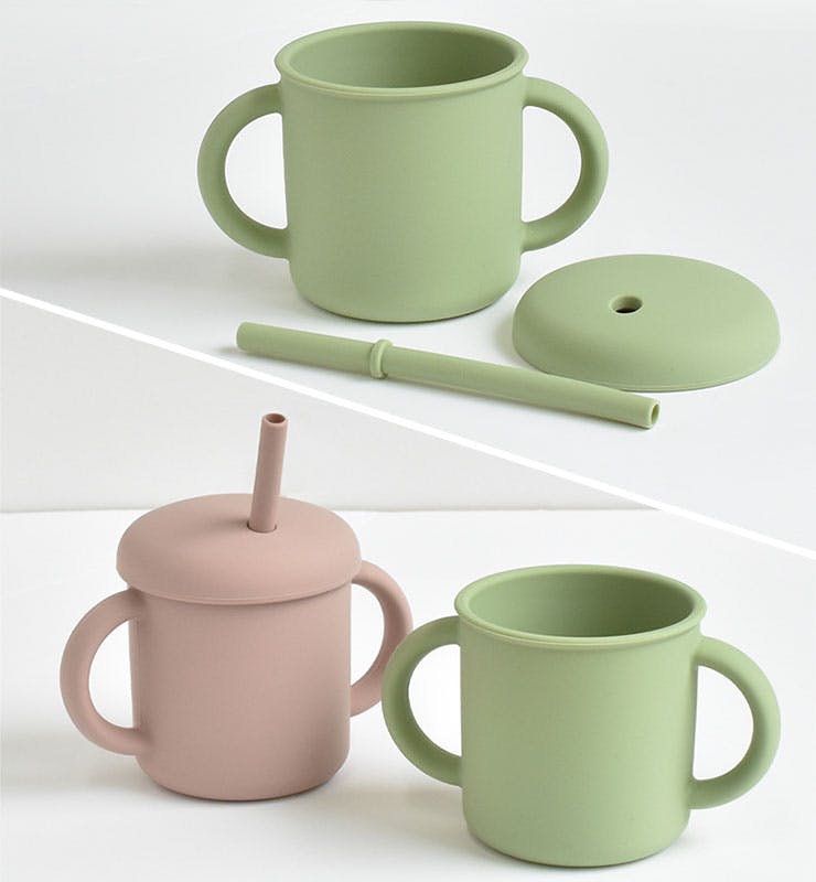 シリコーン素材のマグ。 両手ハンドルは子どもが一人でも持ちやすく、ストローが手前に傾く飲みやすいオリジナル型。 抗菌効果のあるシリコーン素材で、フタなしでも使える2WAYタイプのシンプルなデザインマグです。