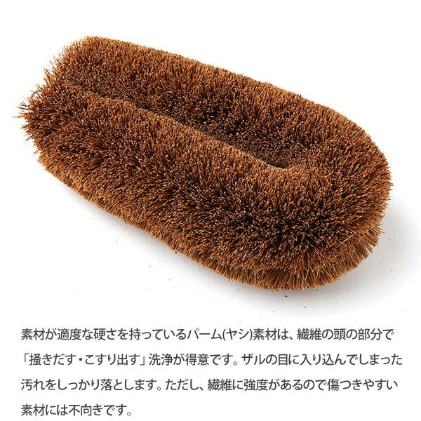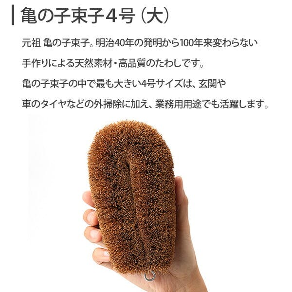 元祖 亀の子束子。明治40年の発明から100年来変わらない手作りによる天然素材・高品質のたわしです。 元祖亀の子束子。手作りによる天然素材・高品質のたわしです。1号よりもひとまわり大きい3号サイズは、大きな鍋・釜・まな板などを洗浄するのに最適です。広い洗浄面を活かして浴室でのお掃除にも活躍します。 素材が適度な硬さを持っているパーム(ヤシ)素材は、繊維の頭の部分で「掻きだす・こすり出す」洗浄が得意です。 ザルの目に入り込んでしまった汚れをしっかり落とします。ただし、繊維に強度があるので傷つきや
