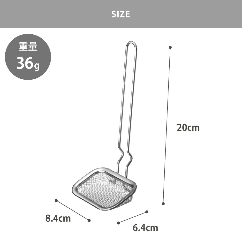角型揚げ鍋の角まですくえるカス揚げです。 アミの底面が平らになっているため、しっかりすくえます。 カス揚げ用途の他、揚げアミとしてもお使いいただけます。