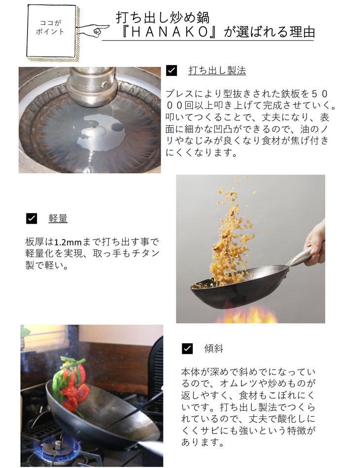 日本で唯一の打ち出し製法で作られている、山田工業所の家庭用フライパン HANAKOシリーズ。 山田工業所は業務用フライパンを作り続けて半世紀以上、横浜中華街でのシェア率80%を誇り多くのプロに長年愛されています。 打ち出し製法はプレスにより型抜きされた鉄板を5000回以上叩き上げて薄く延ばしていくことによって、鉄が絞まり軽くて、強くなります。酸化しにくく、サビに強いという特徴もあります。 プレスしただけのフライパンと比べ、鉄取りがすくないので軽く仕上がっています。 ハンドルも軽量で熱くなりにく