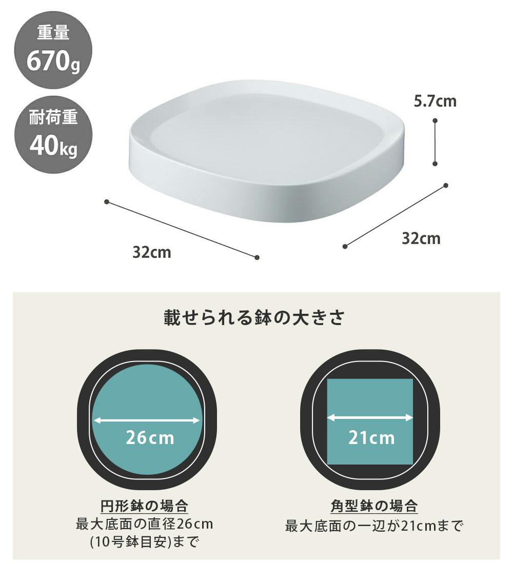 有効内寸 26×26cm 円形鉢:最大底面の直径26cm(10号鉢目安)まで 角型鉢:最大底面の一辺が21cmまで