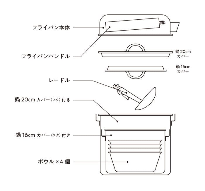 ●フライパン 全長39.8cm/内径20.8cm/深さ5.8cm ●鍋20cm 蓋付き 内径20.0cm/深さ15.0cm/容量4.7L ●鍋16cm 蓋付き 内径16.0cm/深さ11.0cm/容量2.3L ●レードル 長さ19cm ●ボウル×4個 内径約14.0cm/深さ5.0cm ●ケース