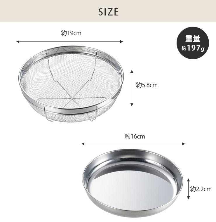 ザル:径19.0×高さ5.8cm、トレー:径16.0×高さ2.2cm