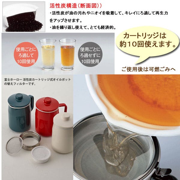 便利主義に徹した調理の名脇役。活性炭が油の汚れやニオイを吸着して、キレイにろ過します。油を繰り返し使えて、とても経済的です。